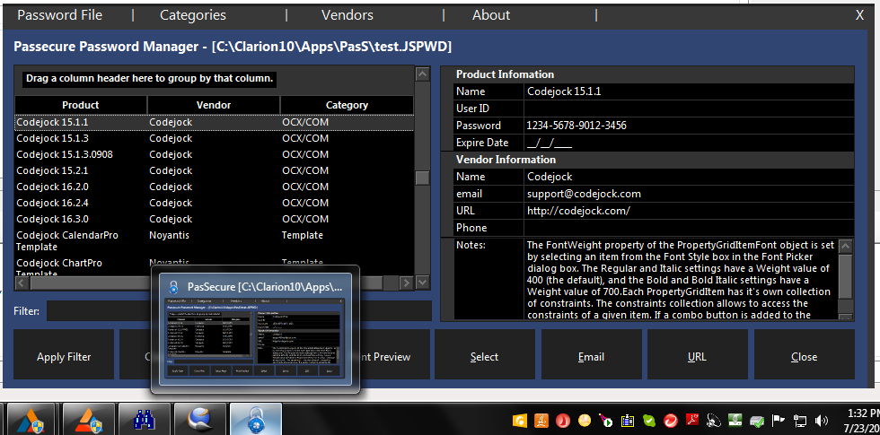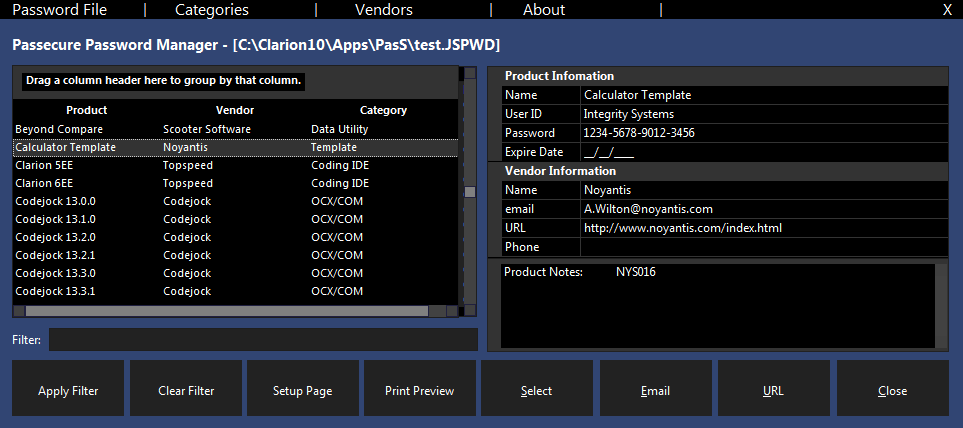 Passecure is a standalone 32 bit Windows executable that provides a secure means of storing your most sensitive passwords and other information. The data file is encrypted using the password that you supply, so it is a relatively secure means of storing your information.